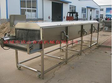 清洗机采用水浴式气泡清洗,物料在水中通过气泡在释放过程中产生的翻腾效果,使物料在水中发生不规则的强烈翻转运动,通过物料的运动有效分离被清洗物表面附着物,模拟人工清洗基本动作,同时由于物料是在汽水混合物中产生的翻腾运动,有效避免了清洗过程中产生的碰、磕、划伤等对物料的损伤现象,提高了工作效率,变人工作业为机械化加工。适合于各种新鲜水果、蔬菜、盐渍菜、菌类、海产品。该清洗机在物料输送过程中,增加了喷淋清洗功能,使物料在完成汽水浴清洗后,再经过喷淋清洗,该道工序的作用是将物料表面的脏水替换去除,提高物料的清洗效果,同时,外来的清洁喷淋水在对物料进行二次清洗后,水自动流入水浴槽中,达到替换补充水浴槽内的清洗水,保持了水浴槽内水质的清洁度,即提高了清洗水的利用率,又增加了清洗效果。